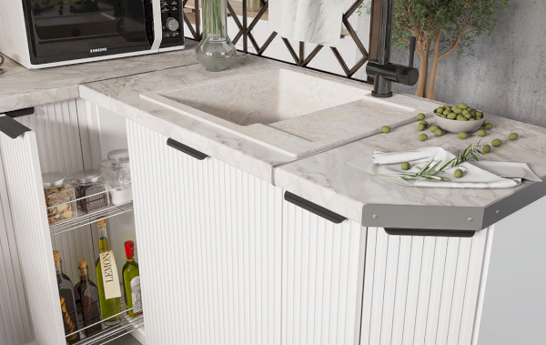 Столешница в комплект не входит и приобретается отдельно из представленного ассортимента. Высота кухонного гарнитура изменяется в зависимости от вашего варианта установки.